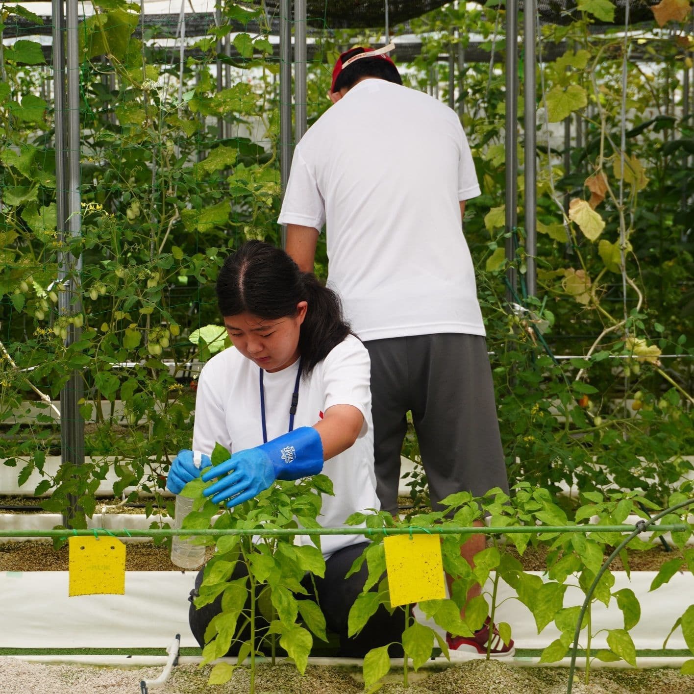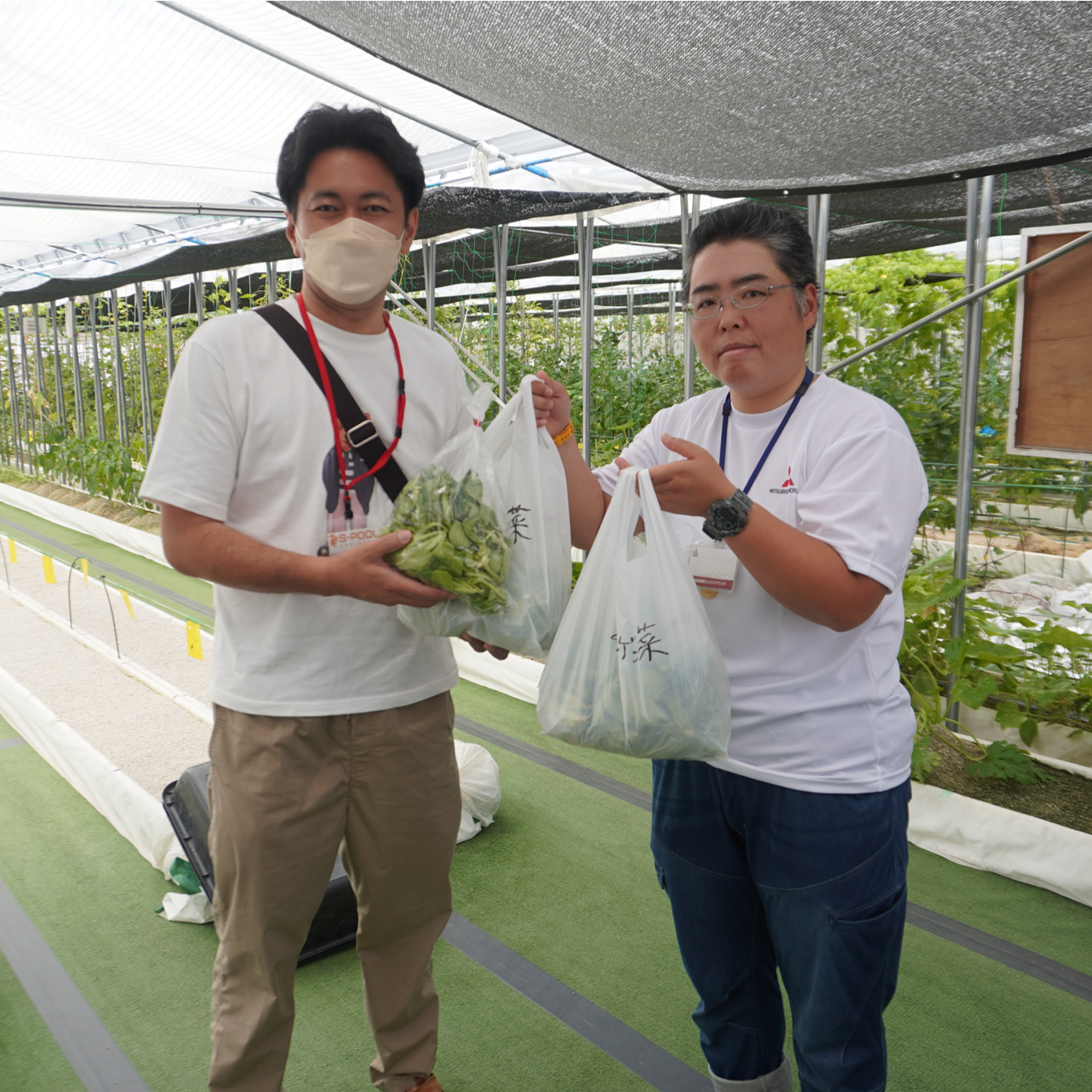 安心・安全に働くことができる障がい者仕様の2棟のビニールハウスを使用して、農場長・スタッフの皆さんが無農薬の水耕栽培で色々な野菜づくりにチャレンジしながら、採れたて新鮮な野菜を地域の施設等へ無償提供しています。