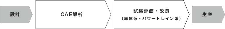 車体強度、振動・騒音、運動性能、冷却・熱害などクルマの基本各機能について開発初期からCAE解析、シミュレーションで性能予測の上、改良を盛り込み、車両や台上で各種の試験・評価を行います。